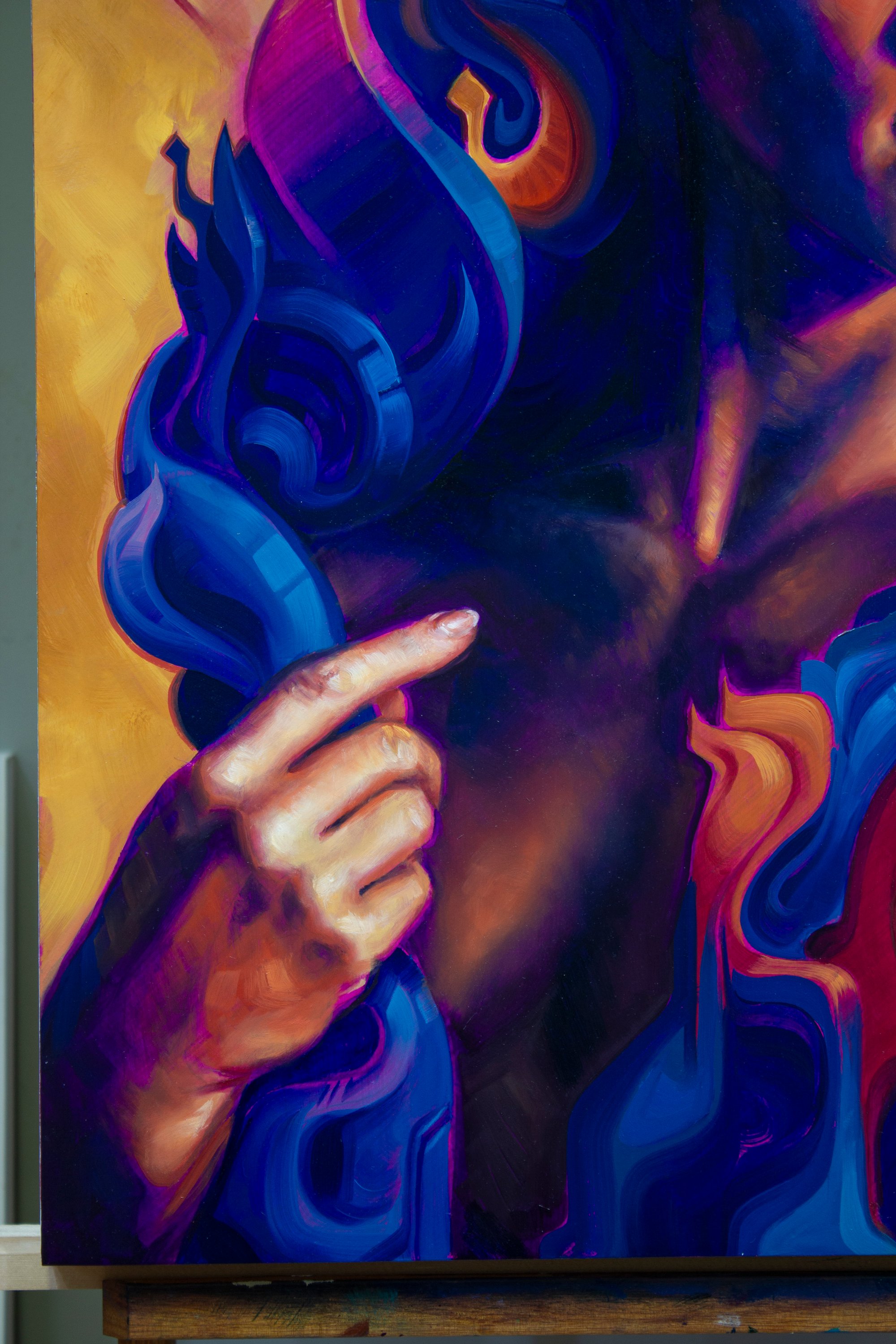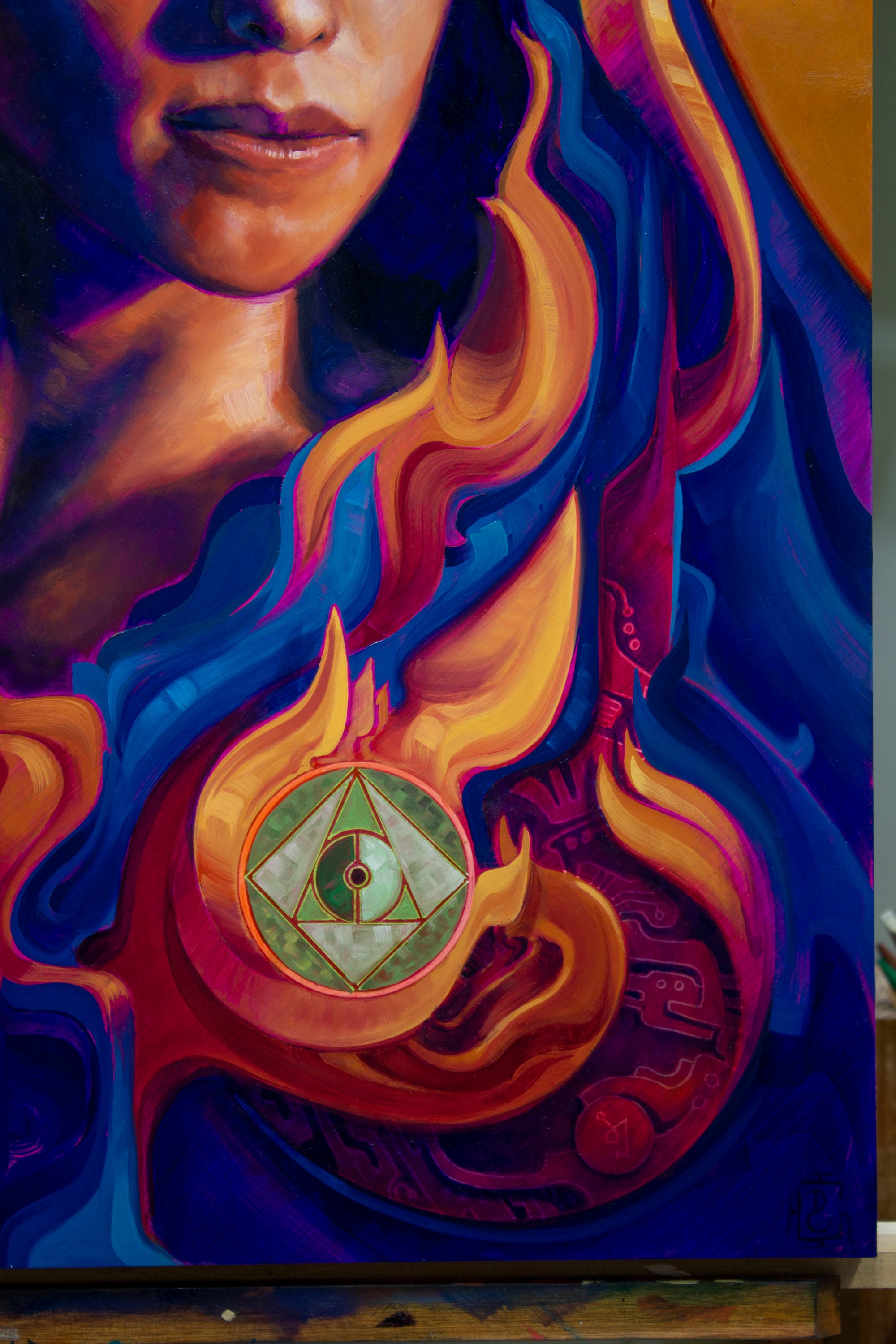 This portrait developed in an unusual way, in that I did not set out to make a portrait of Maria Prophetissa. I liked a portrait shot of a model that I had, and decided to use it as a basis for the painting. I arrived at the concept for the piece by looking at the image and letting whatever thoughts and feelings I had to arise. The idea of alchemy came to me quickly, but at first I pursued a more abstract concept, that of the alchemical stages of distillation and sublimation. The imagery as you see it in the piece came before I knew anything about Maria. Slowly, it felt that I was creating a portrait of someone in particular, but did not know who. By chance, I came upon the historical figure of Maria Prophetissa while idly researching alchemical apparatus. It turns out she is credited for several apparatus that are still in use in chemistry labs today. One of these is the bain-marie (Mary’s Bath) which is named after her and is used in modern kitchens. I was surprised that I had never heard of her, as she is considered an important figure in the history of alchemy and chemistry. Perhaps it is because she was both a woman and Jewish. I now feel as though this portrait is an attempt to reawaken her legacy.