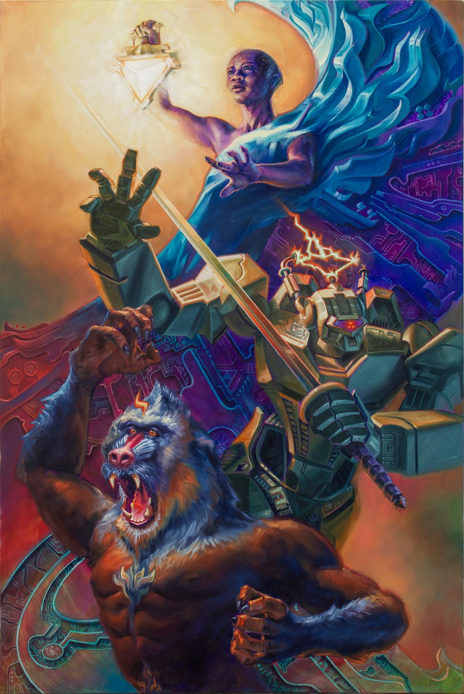 Three aspects of our psyche. The Ape: our passions and animal instincts. The Robot: our drive to create order, efficiency, and logic. The Angel: a spirit of compassion attempting to enlighten the darkness.